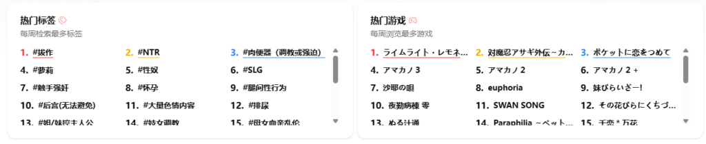 然后网站内给出了两个排行榜功能,热门标签以及热门游戏,这可以作为你查找游戏的参考: